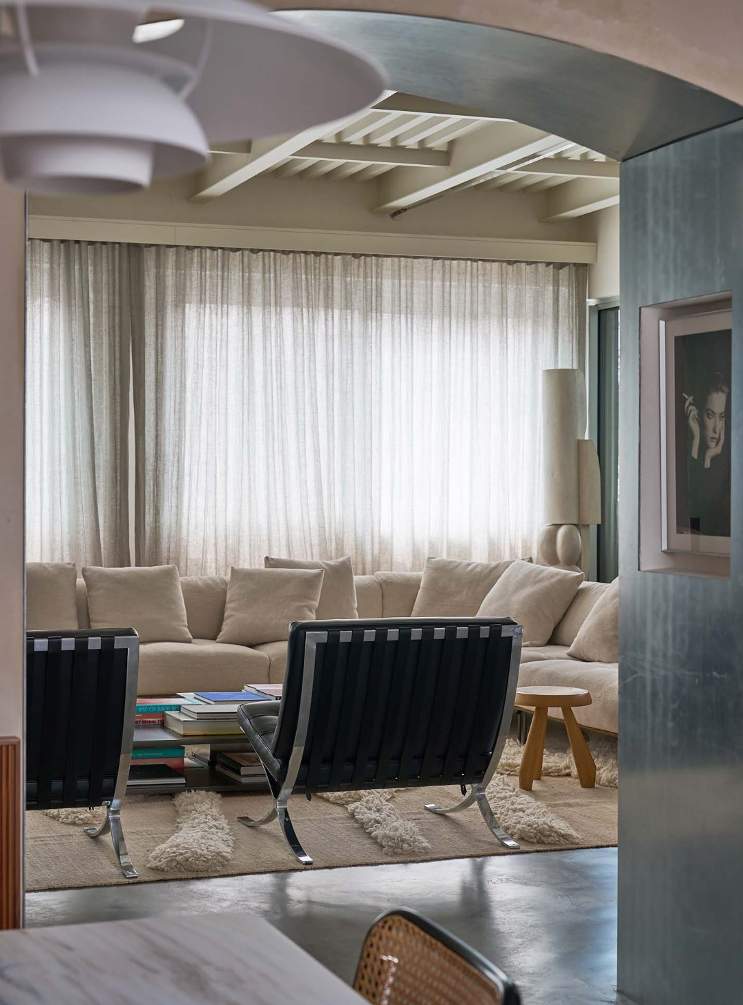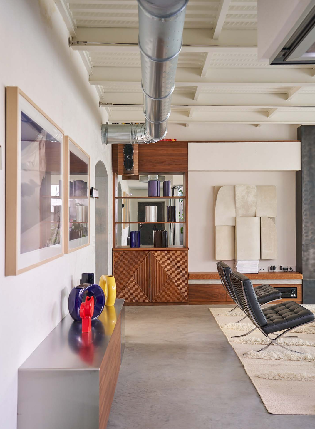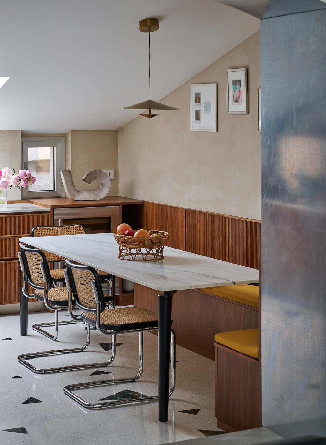- Bathed in light and framed by a private terrace, the property combines the polish of a bourgeois address with the raw pulse of contemporary design. Concrete floors set a quiet rhythm underfoot, while bespoke carpentry and sculptural furniture define the space with precision and intent. Each line feels considered, each texture deliberate — from the custom kitchen’s sleek geometry to the curated mix of art and design pieces.